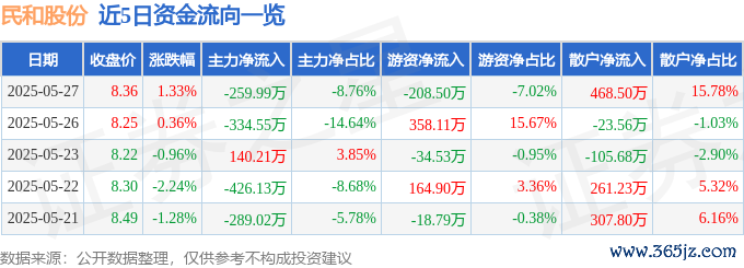 本站消息,截至2025年5月27日收盘股票配资平台注册,民和股份(002234)报收于8.36元,上涨1.33%,换手率1.19%,成交量3.57万手,成交额2968.75万元。