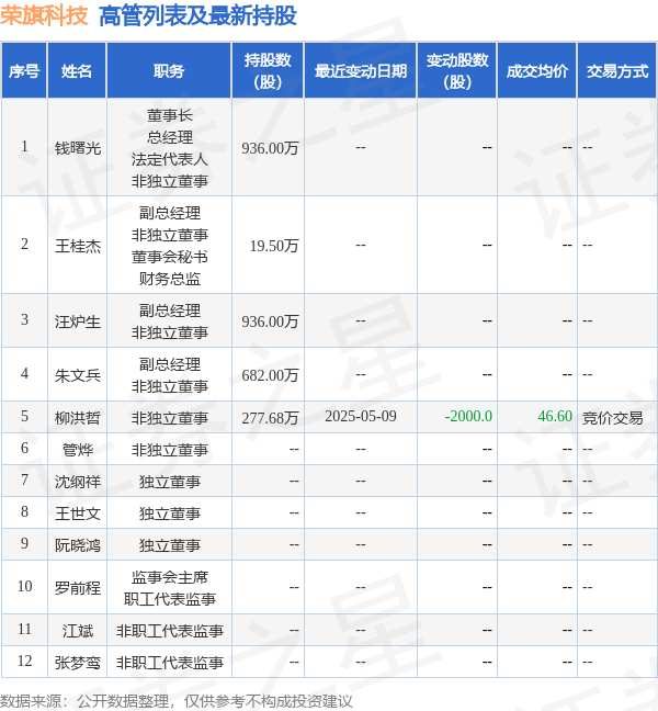 荣旗科技近半年内的董监高及核心技术人员增减持详情如下: