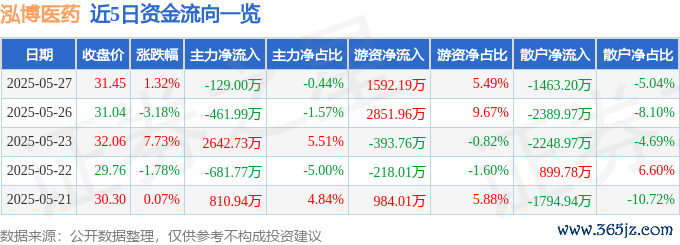本站消息,截至2025年5月27日收盘,泓博医药(301230)报收于31.45元炒股配资首选配资,上涨1.32%,换手率12.02%,成交量9.24万手,成交额2.9亿元。