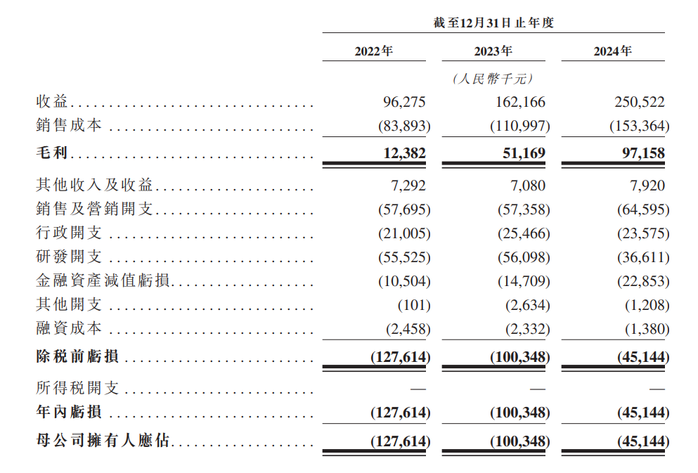 从斯坦德机器人近三年的财务表现来看,随着公司收入增长,净亏损正在逐步收窄。招股书显示,2022年至2024年,斯坦德机器人的收入分别为9627.5万元、1.62亿元、2.51亿元;毛利分别为1238.2万元、5116.9万元、9715.8万元;归母净利润连续三年为负值,分别为-1.28亿元、-1亿元、-4514.4万元。